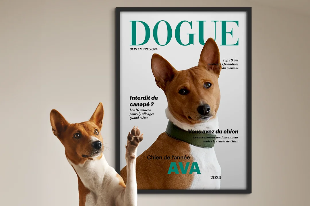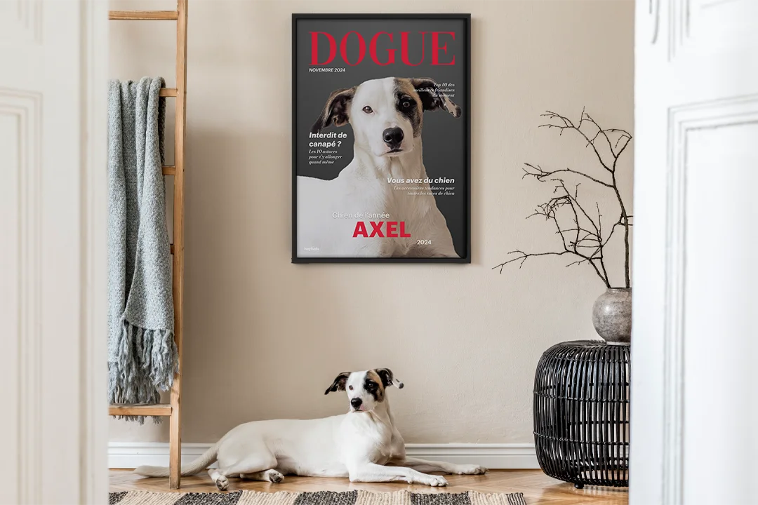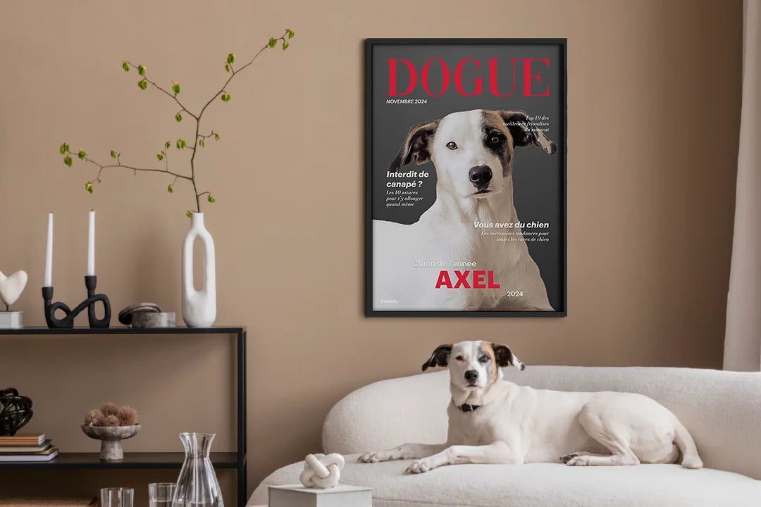 Faites du chien d'un proche une star de couverture. Ce poster "Dogue" est le cadeau personnel parfait et un accroche-regard élégant pour le domicile du destinataire.