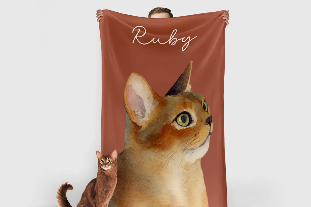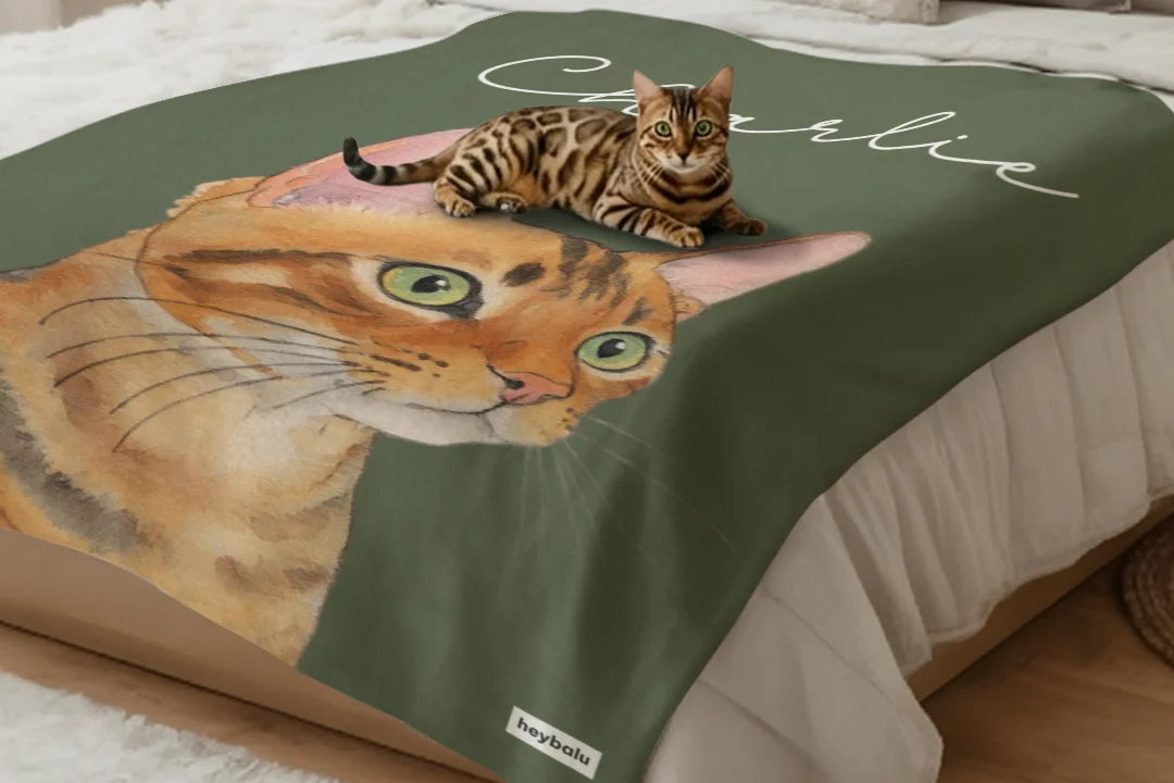 Chaque couverture est imprimée avec le portrait unique de votre compagnon. Les détails de son pelage et de son expression sont soigneusement reproduits pour créer une véritable petite œuvre d’art. Parfaite pour les moments cocooning, comme touche déco ou comme cadeau plein d’attention pour toute personne qui aime son chat.