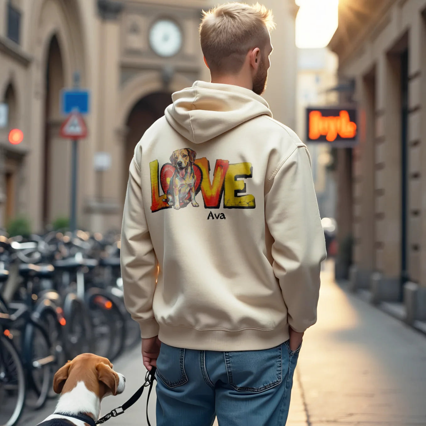 Votre photo devient une illustration LOVE aux couleurs vives, son prénom vient compléter le tout. Le résultat ? Un sweat à capuche qu'on ne trouvera nulle part ailleurs, parce qu'il raconte votre histoire, pas celle de quelqu'un d'autre.