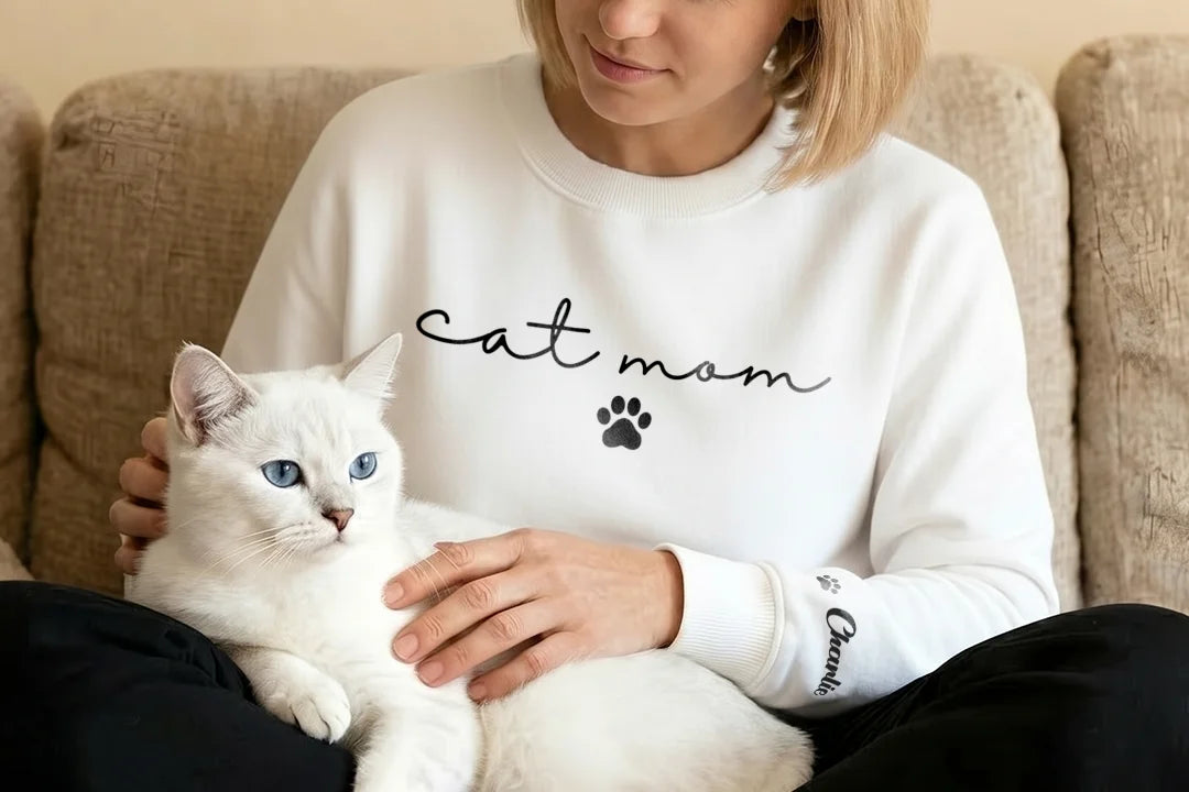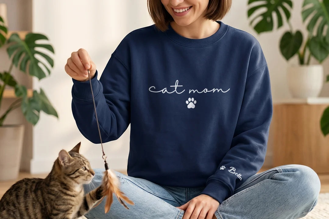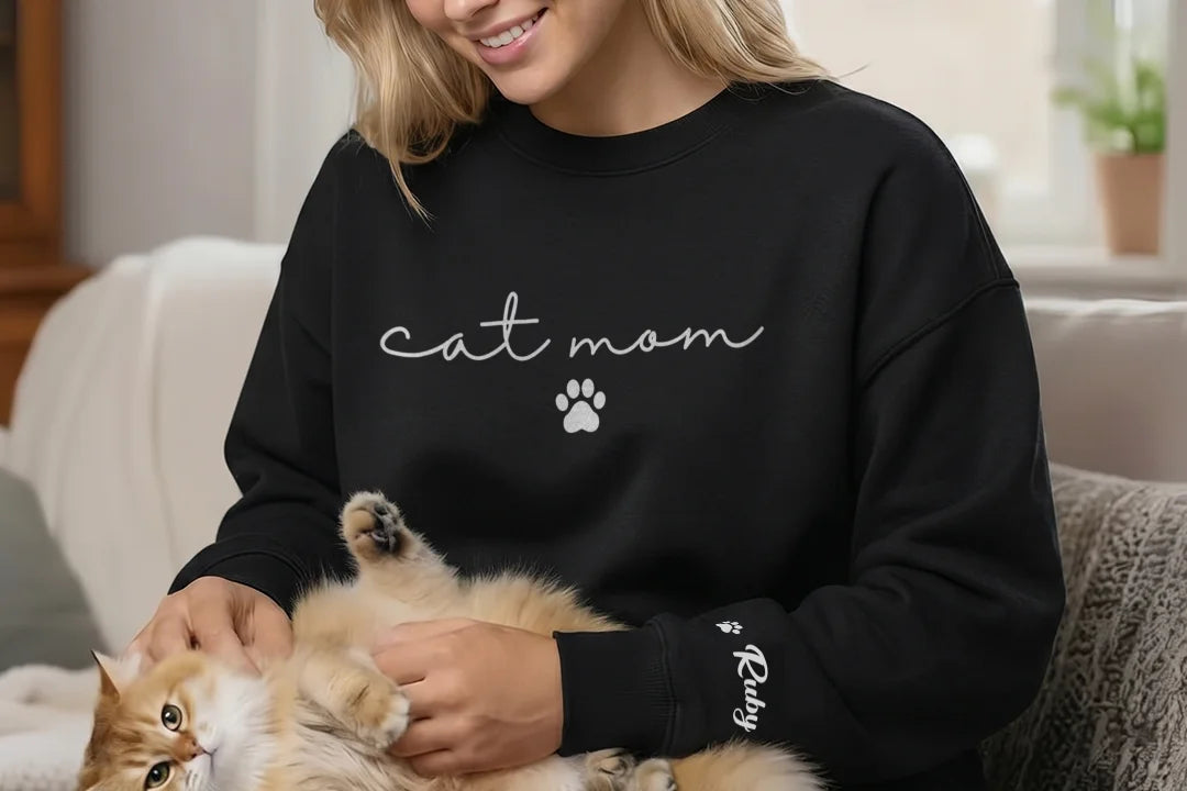 Mit diesem personalisierten „Cat Mom“ Sweater zeigst du auf den ersten Blick, wie viel dir deine Samtpfote bedeutet. Der minimalistische Schriftzug kombiniert mit der süßen Pfote macht dein Outfit zu etwas ganz Persönlichem. Egal ob zuhause beim Kuscheln oder unterwegs – du trägst deine Katzenliebe immer bei dir.