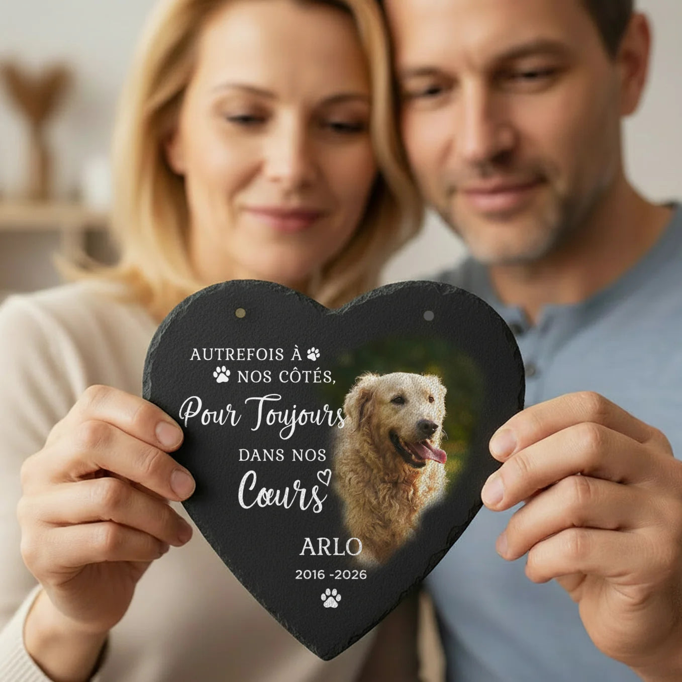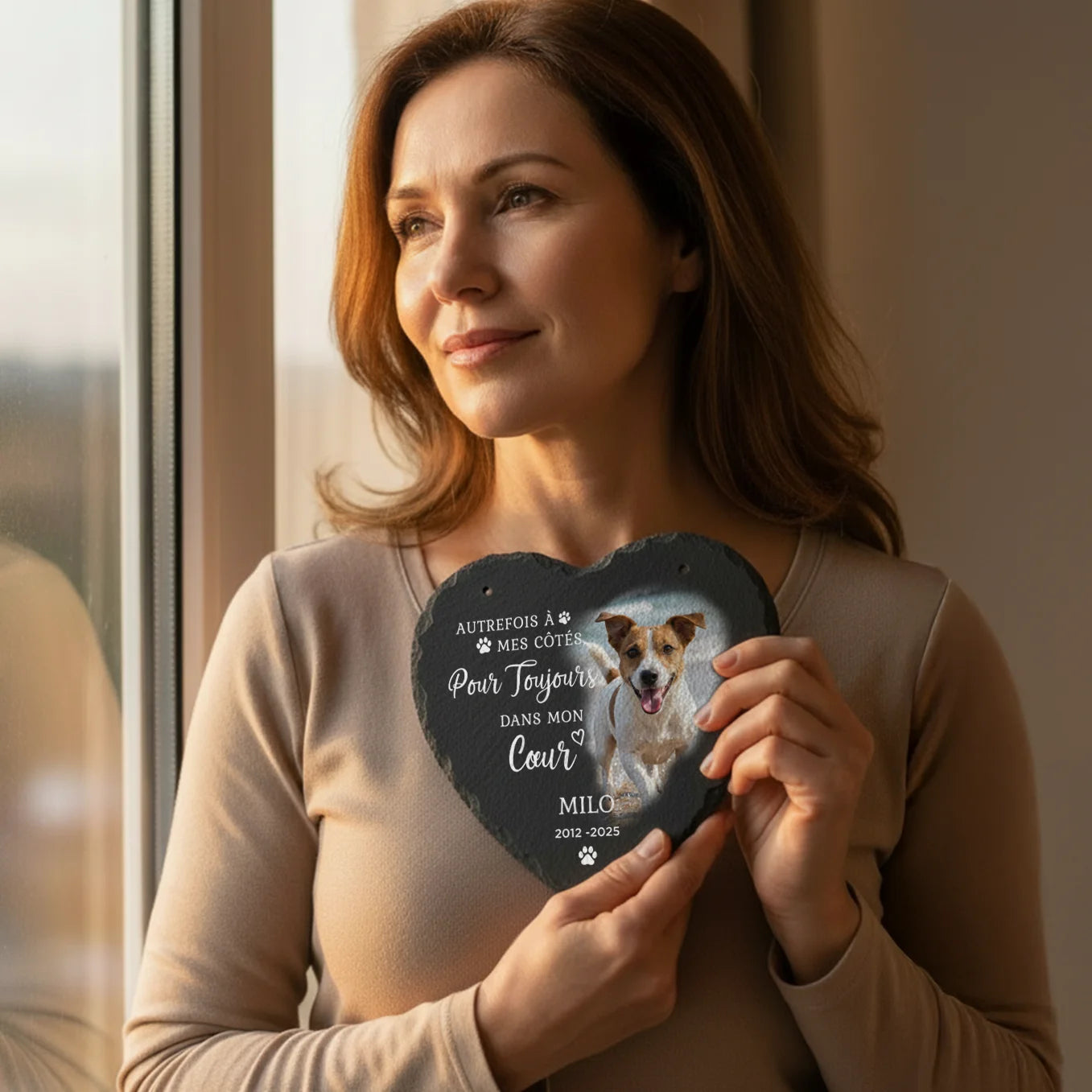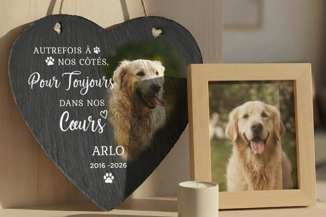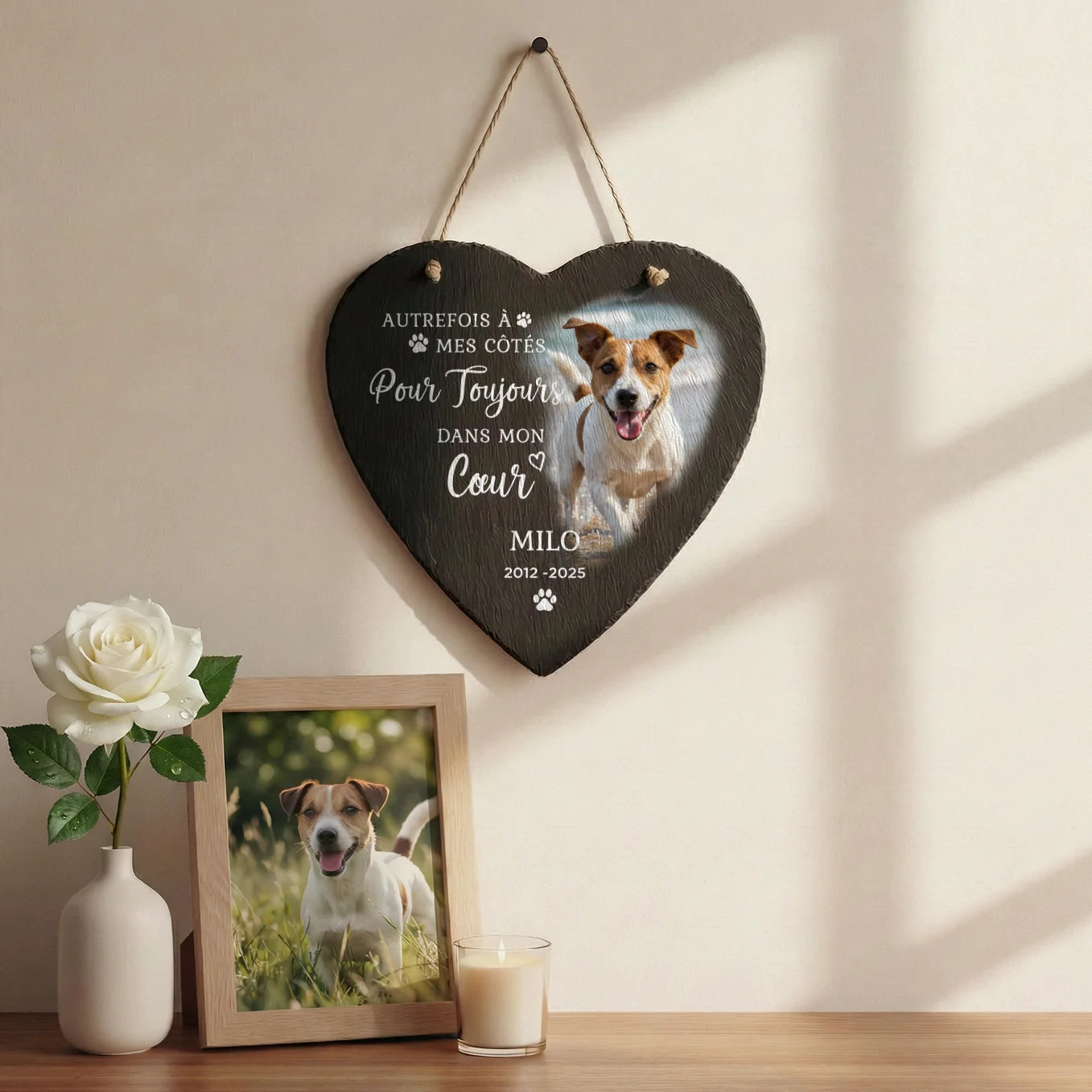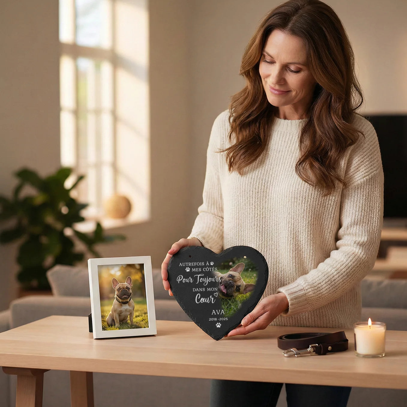 Votre fidèle compagnon garde une place unique dans votre vie. Cette plaque en ardoise en forme de cœur, personnalisée avec sa photo, capture son regard et sa présence. Un hommage délicat à exposer chez vous, comme un doux rappel au quotidien.