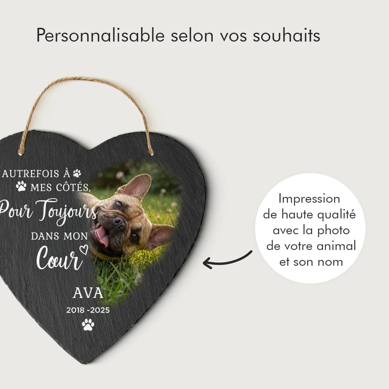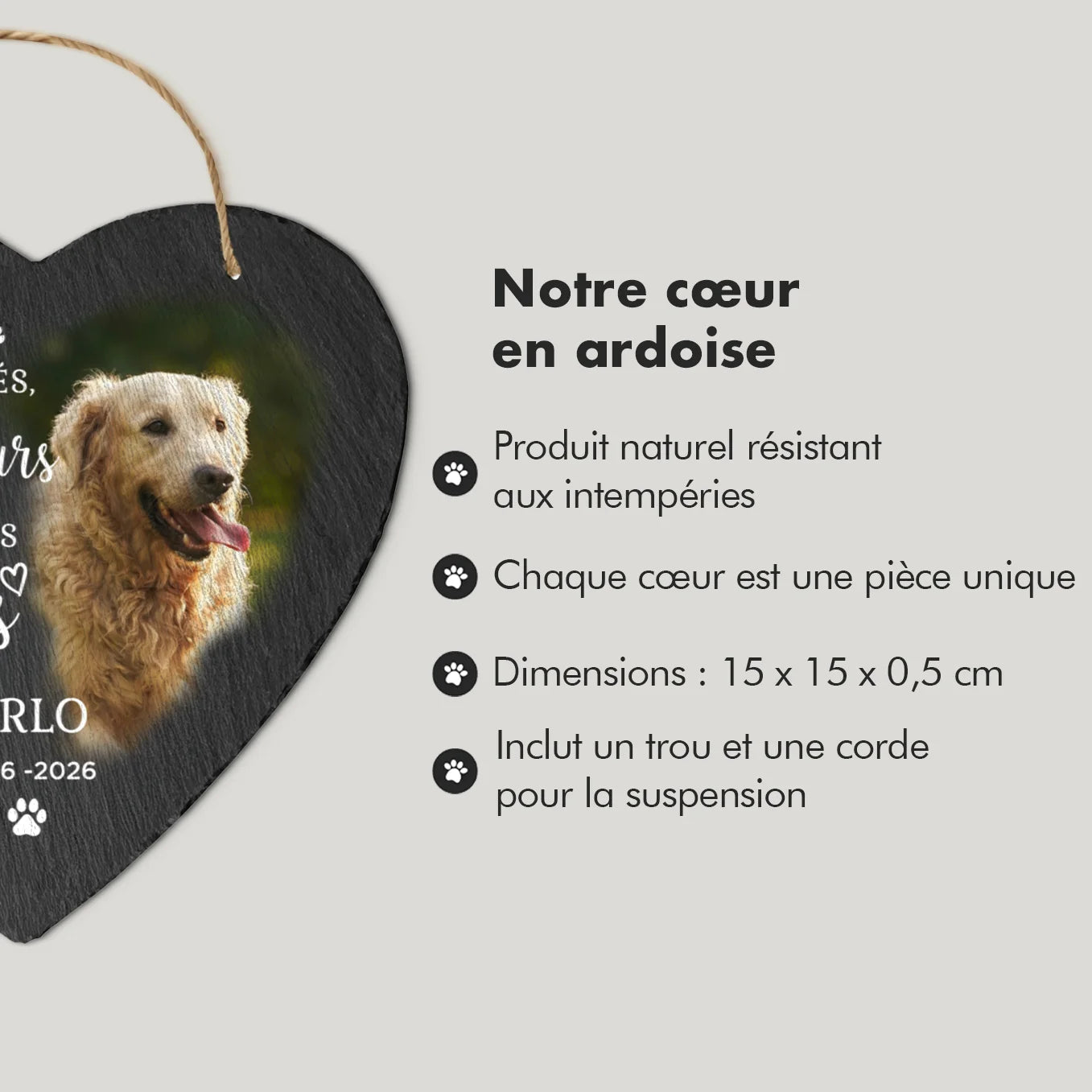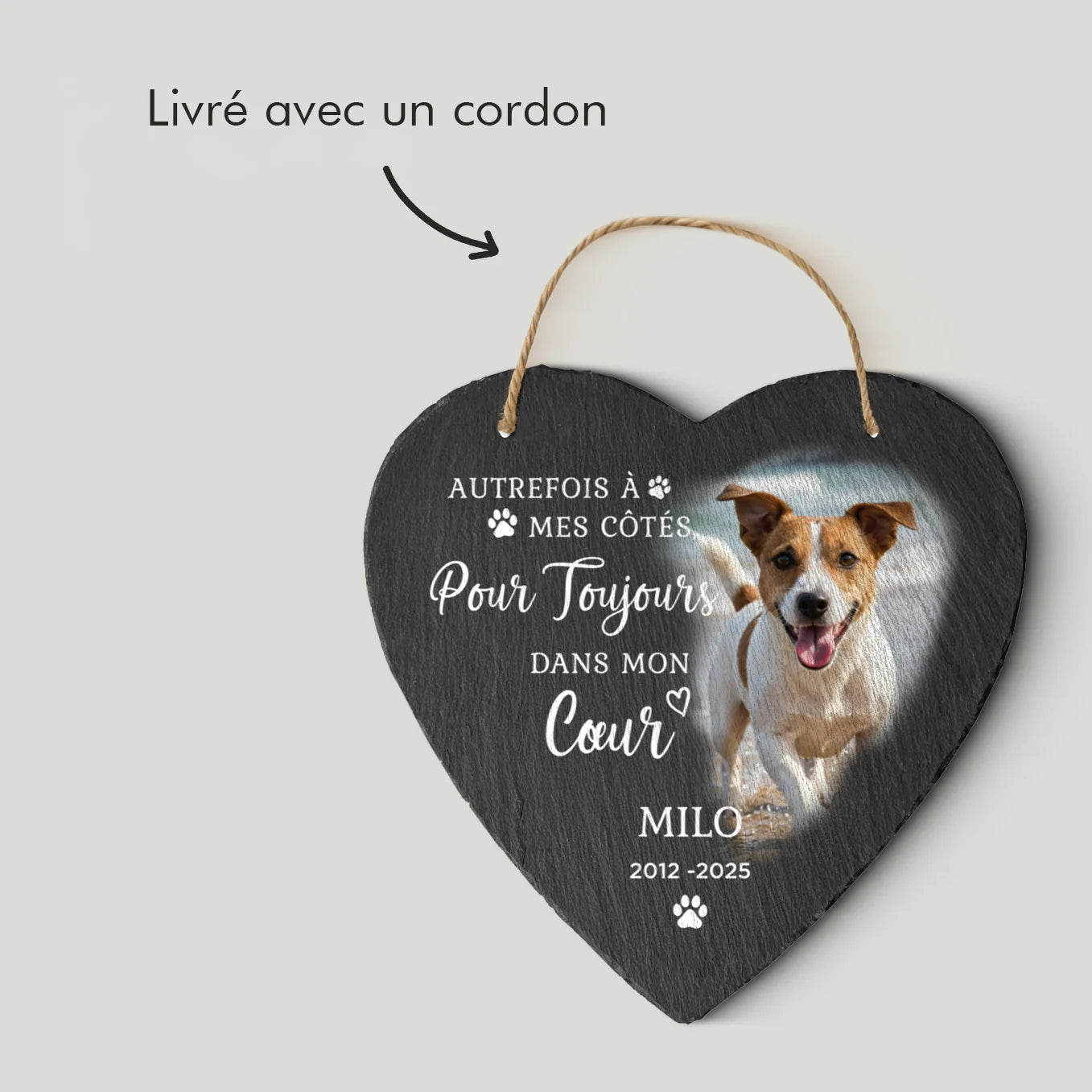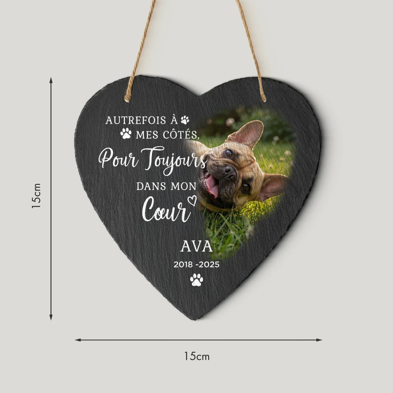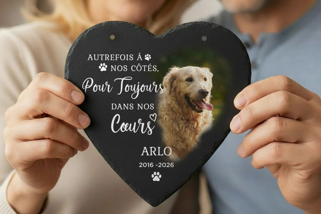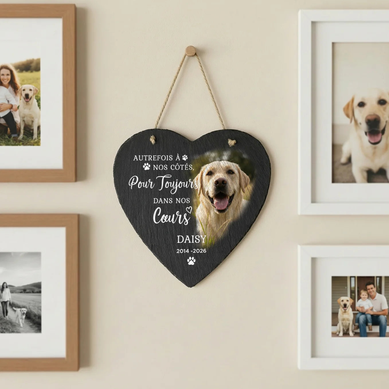 Votre fidèle compagnon garde une place unique dans votre vie. Cette plaque en ardoise en forme de cœur, personnalisée avec sa photo, capture son regard et sa présence. Un hommage délicat à exposer chez vous, comme un doux rappel au quotidien.