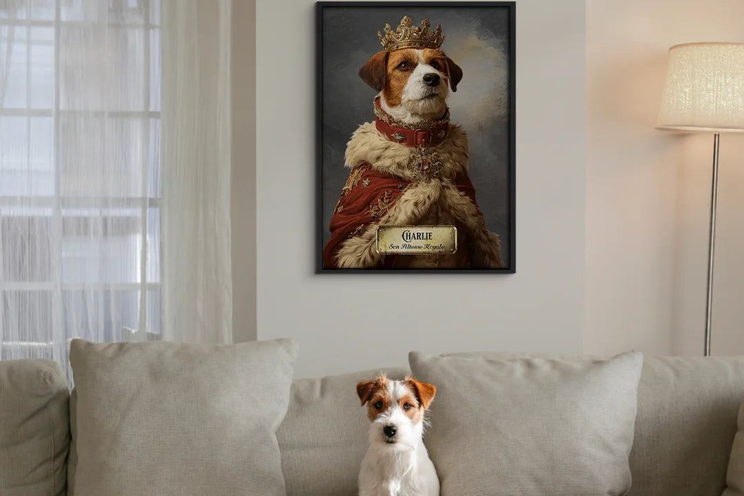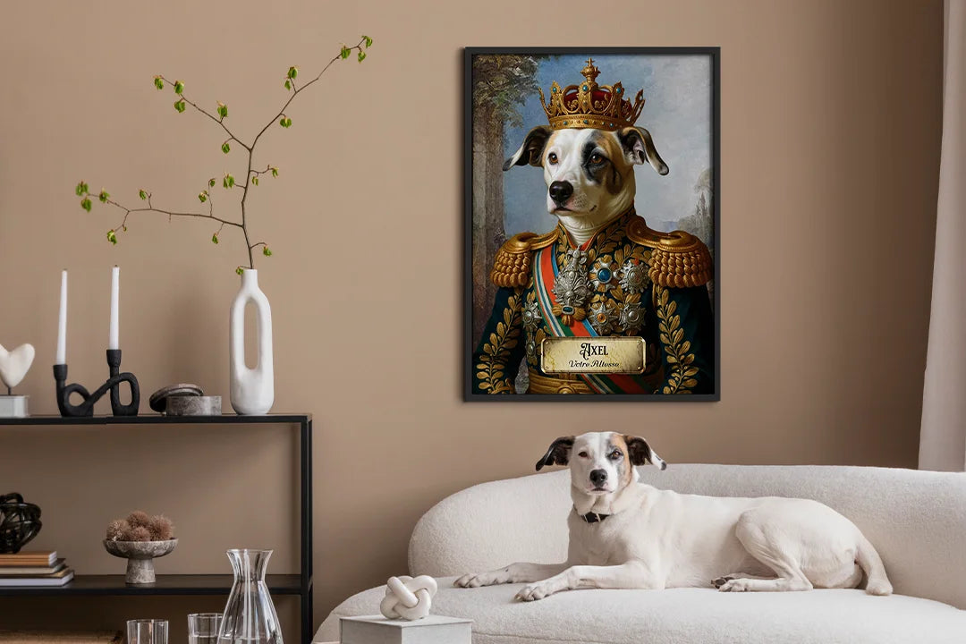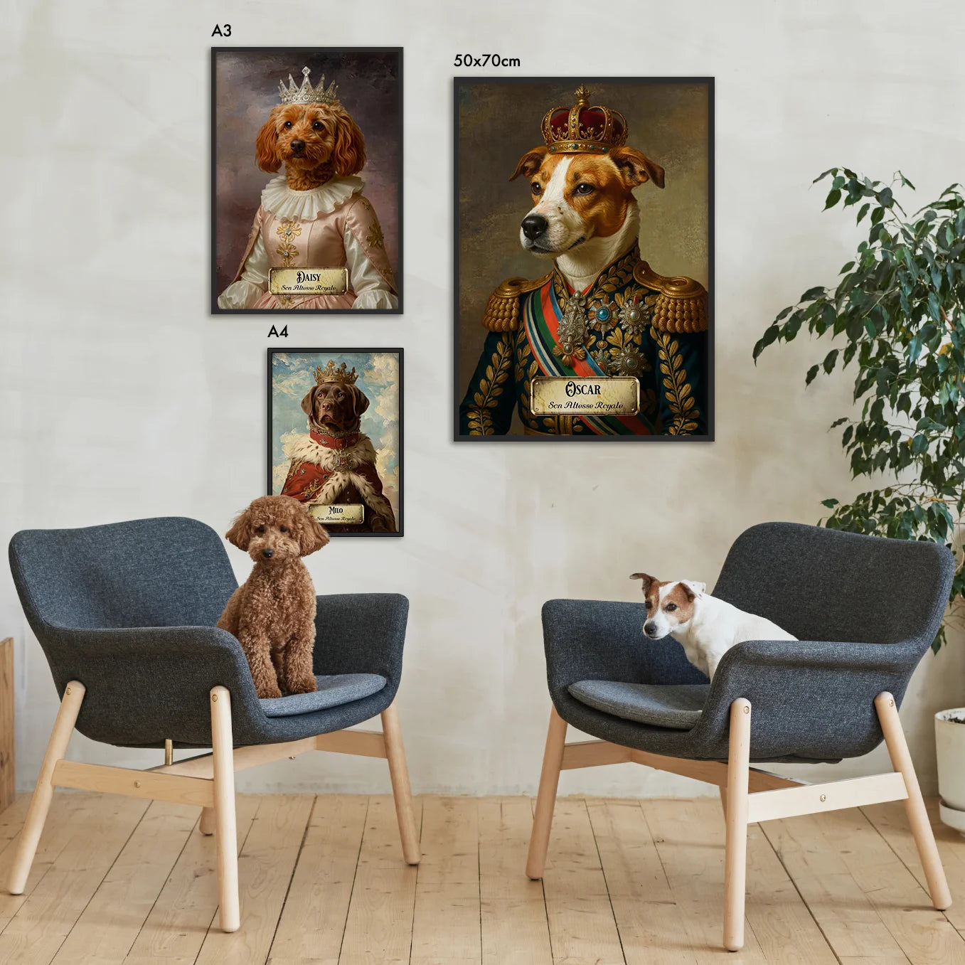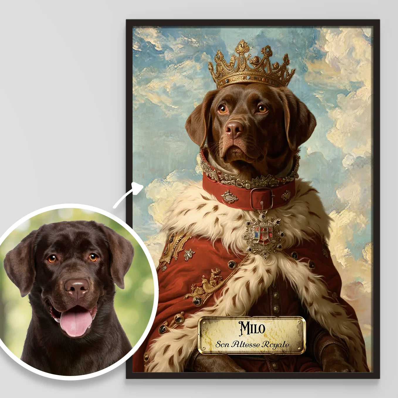 Transformez votre chien en véritable souverain. À partir de votre photo préférée et de son prénom, ce poster personnalisé le met en scène avec élégance. Une création pleine de caractère, idéale à offrir.