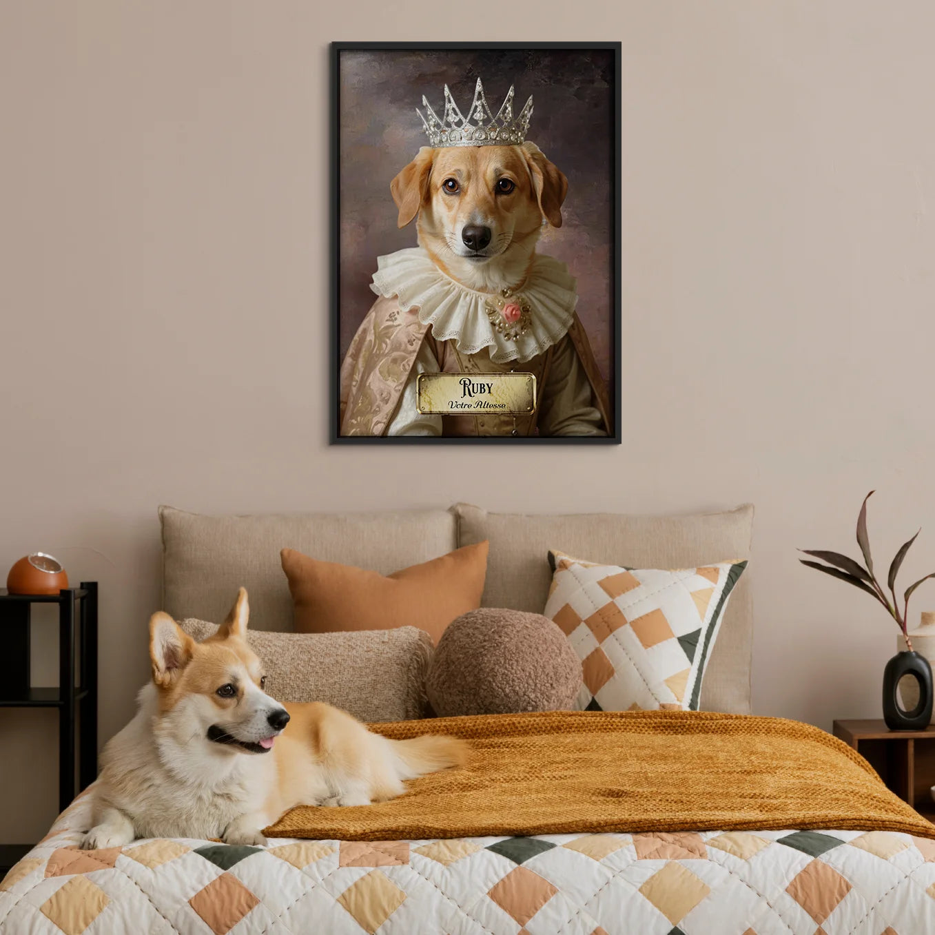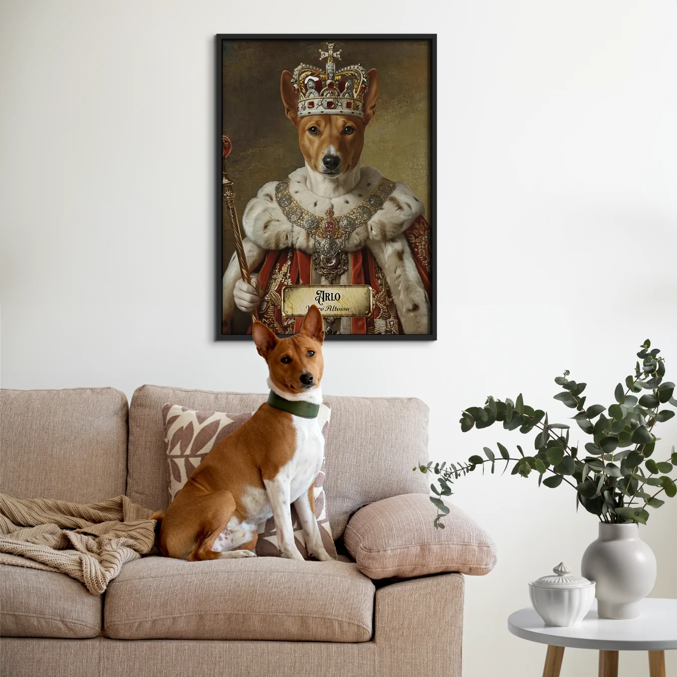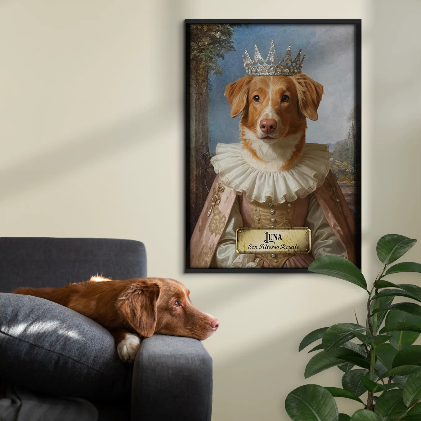 Transformez votre chien en véritable souverain. À partir de votre photo préférée et de son prénom, ce poster personnalisé le met en scène avec élégance. Une création pleine de caractère, idéale à offrir.