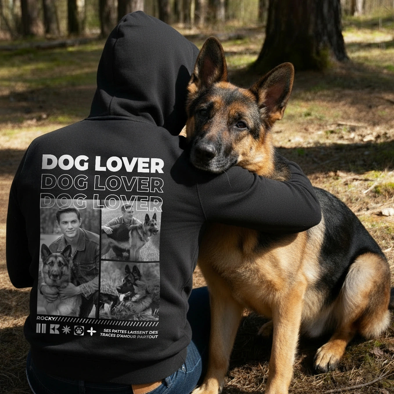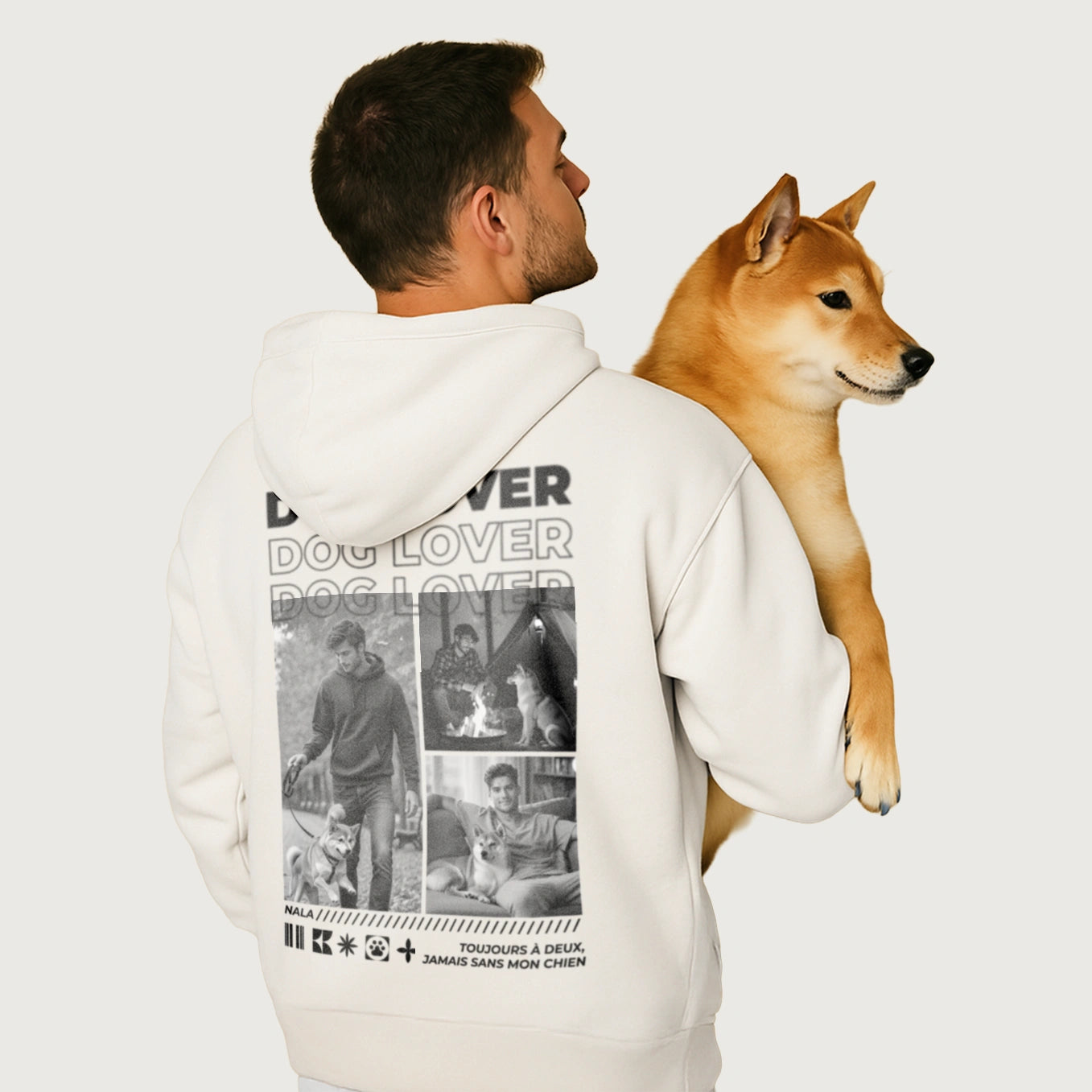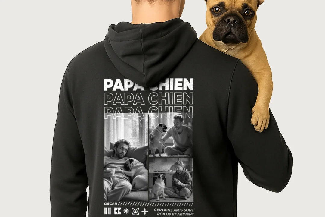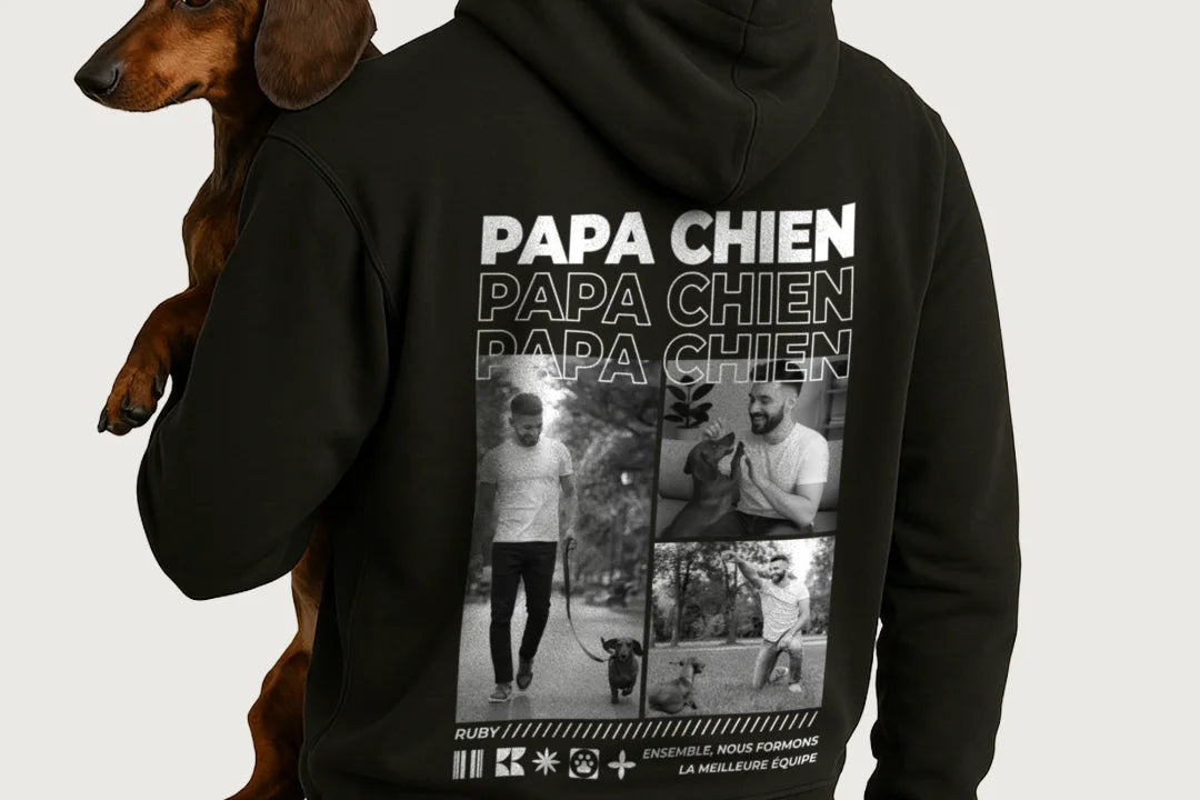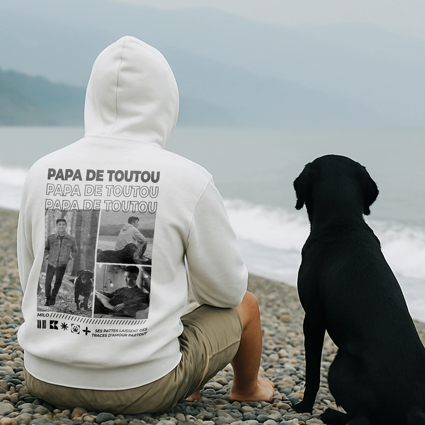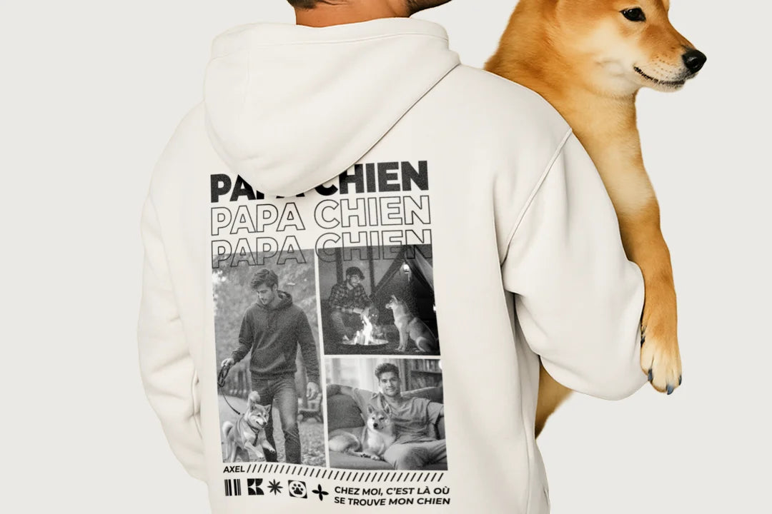 Choisissez votre couleur, votre taille et votre design préféré. Ajoutez vos plus belles photos, les prénoms ou un petit mot tendre : chaque détail est pensé pour raconter votre histoire avec votre fidèle compagnon. Un sweat unique, fait avec amour, pour célébrer le lien qui vous unit.