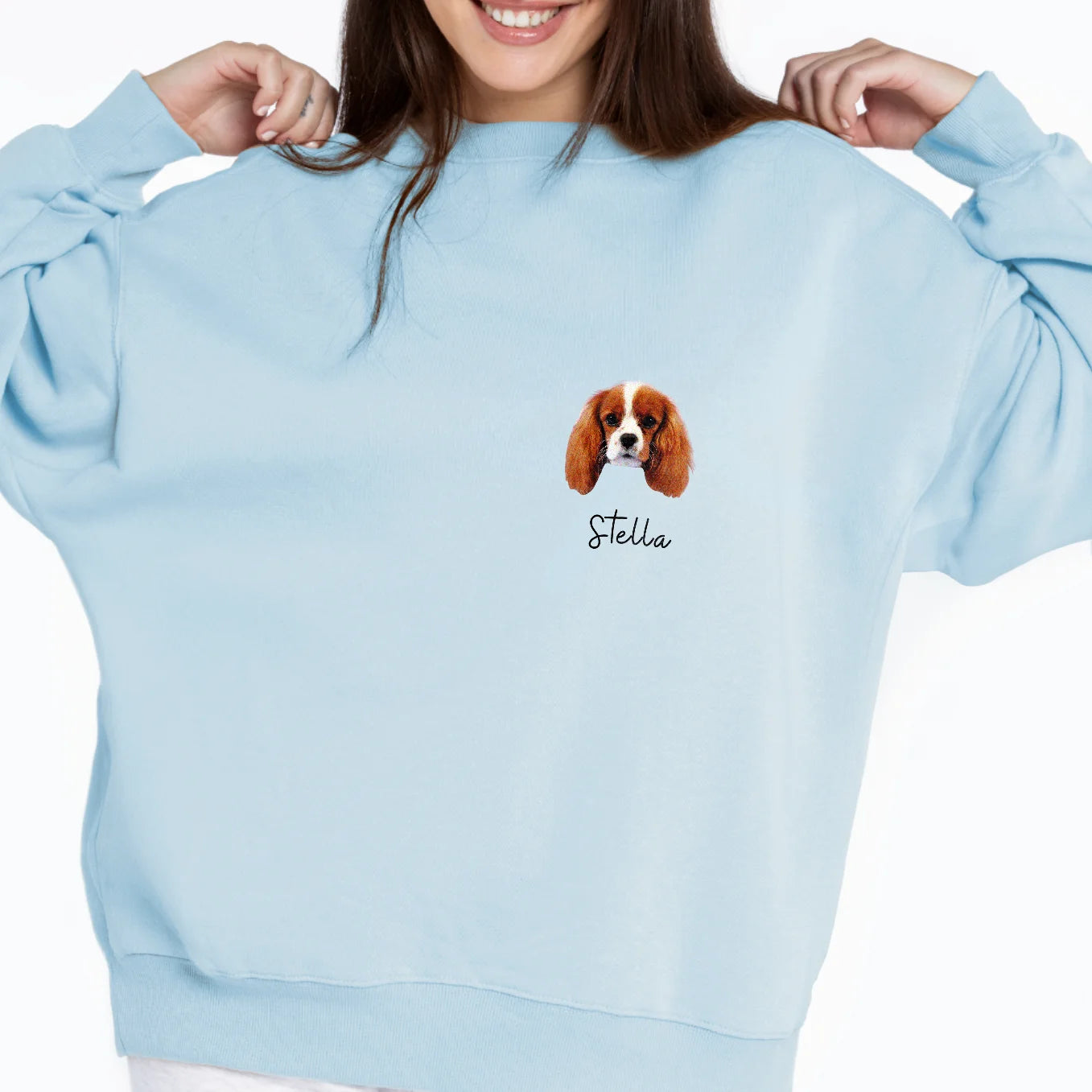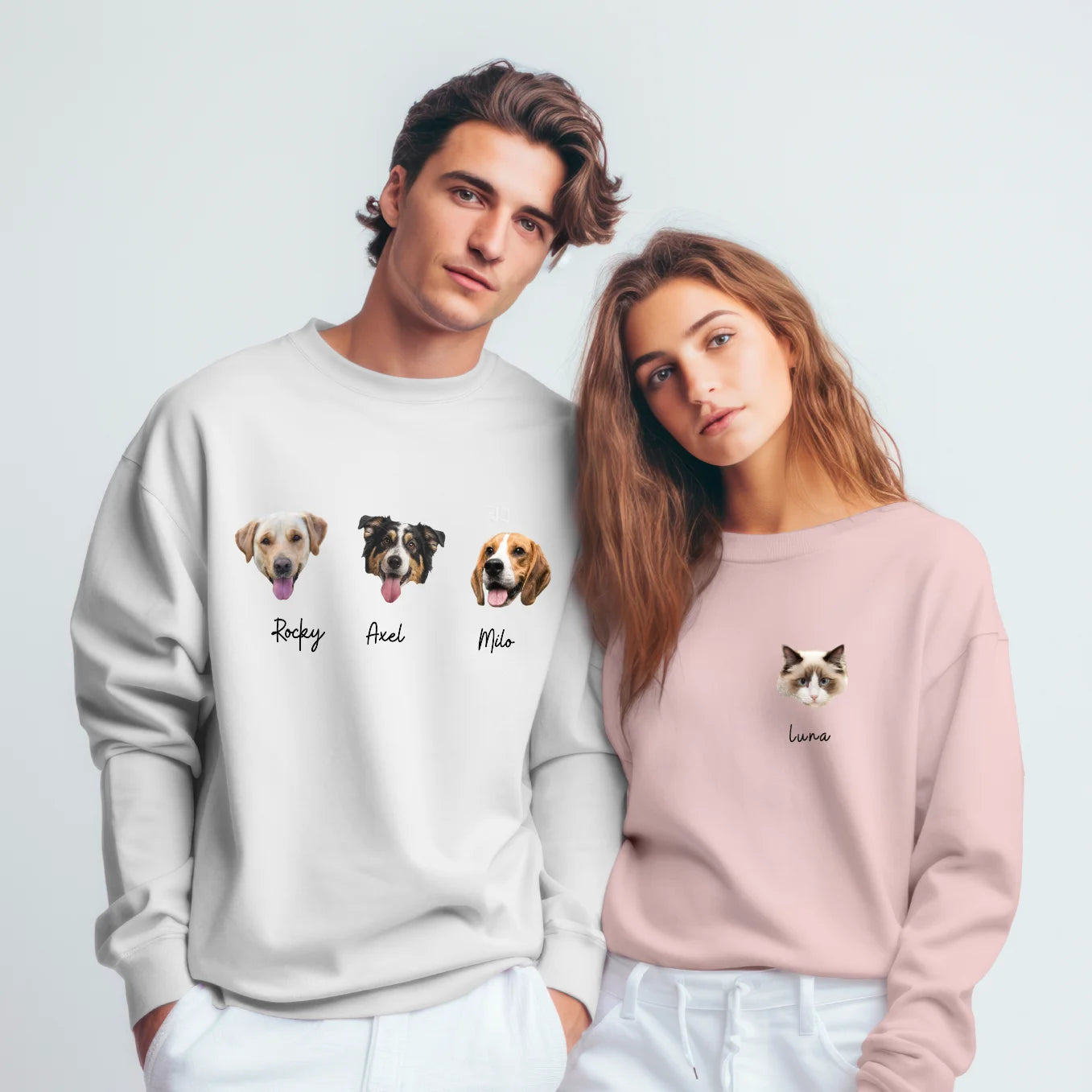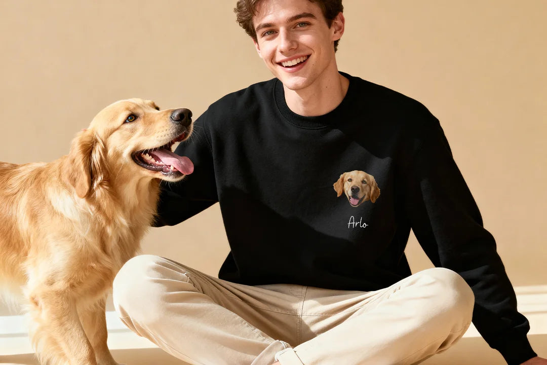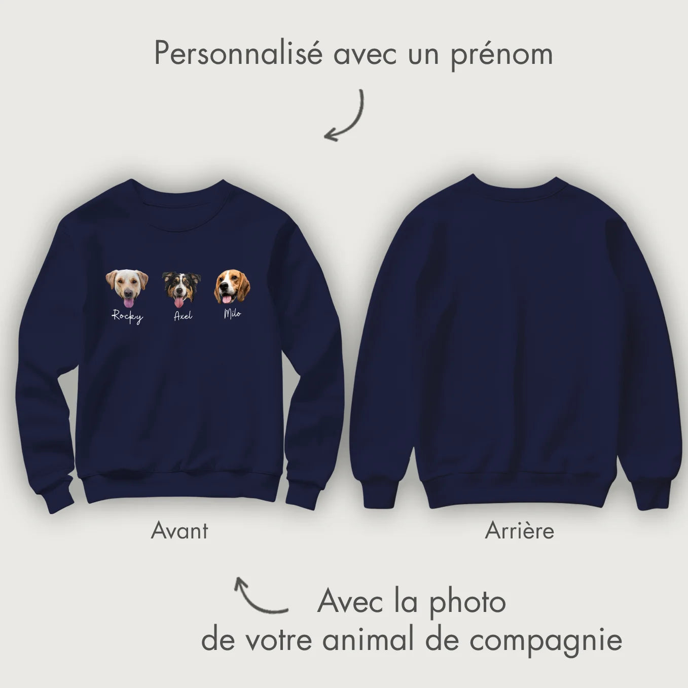 Téléchargez une photo et admirez votre animal préféré sur votre sweat-shirt. Vous pouvez ajouter jusqu'à trois portraits avec leur nom. Créez un vêtement unique et personnalisé.