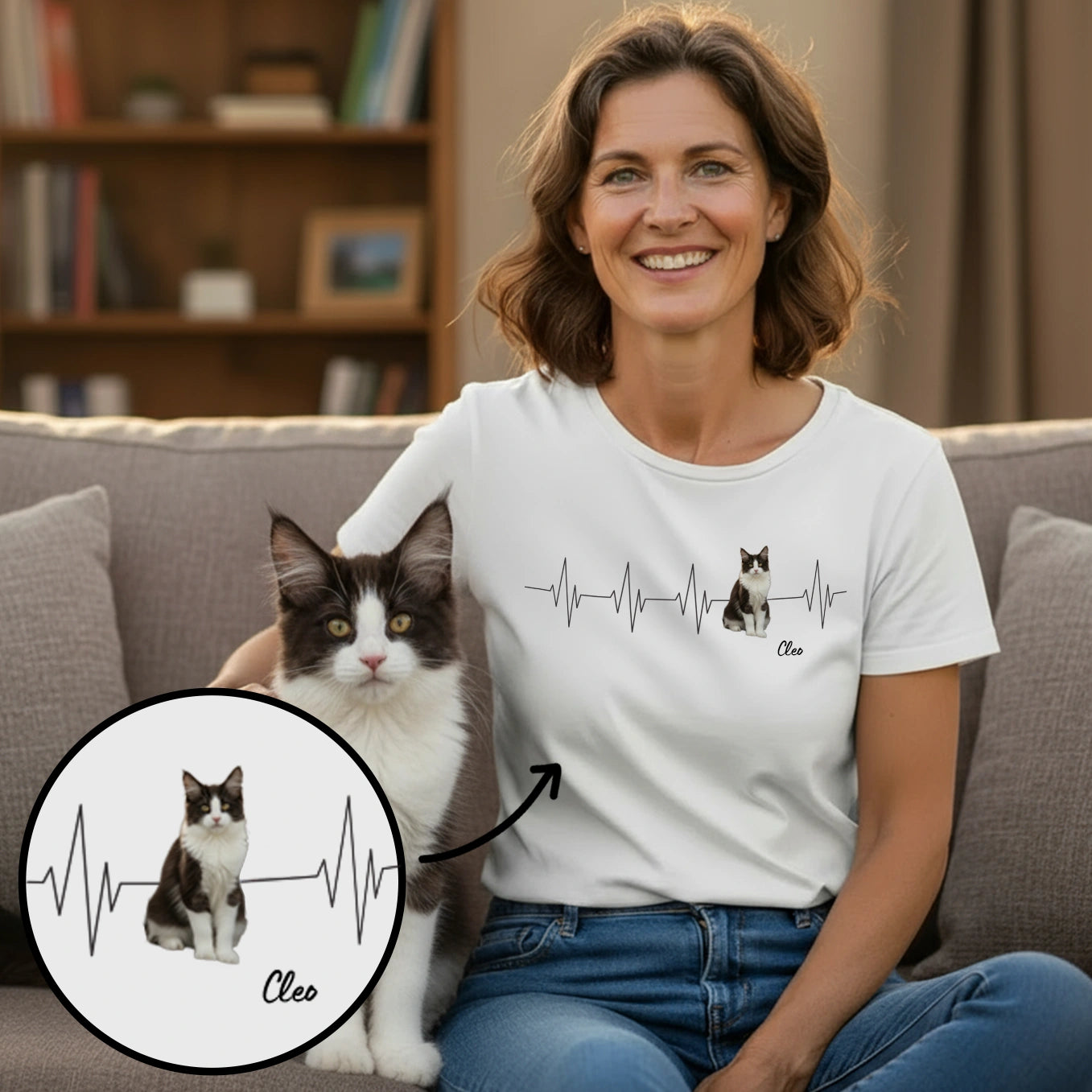 Montrez votre amour pour votre chat avec notre t-shirt unique « Battements de coeur ». Téléchargez simplement une photo de votre chat et nous l'intégrerons dans un design de battements de cœur élégant. Idéal pour les fiers propriétaires de chats !