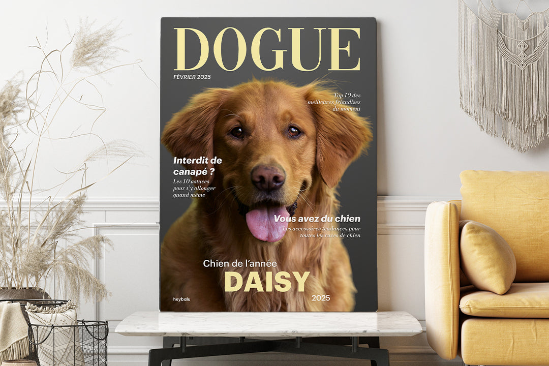 Faites de votre animal une star ! Avec notre toile personnalisée façon magazine canin, votre compagnon à quatre pattes sera la pièce maîtresse de votre intérieur. Téléchargez simplement une photo de votre animal et nous créerons une couverture exclusive qui reflète parfaitement sa personnalité.