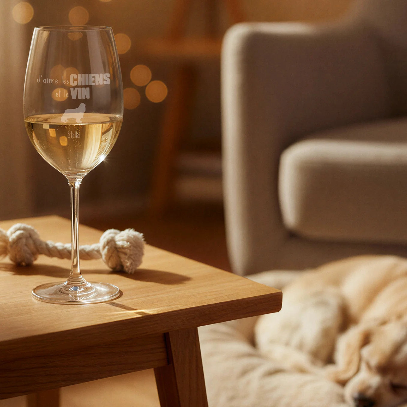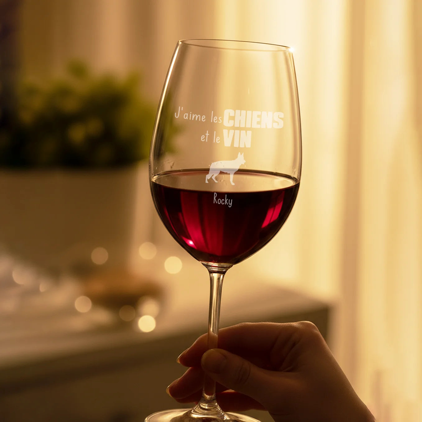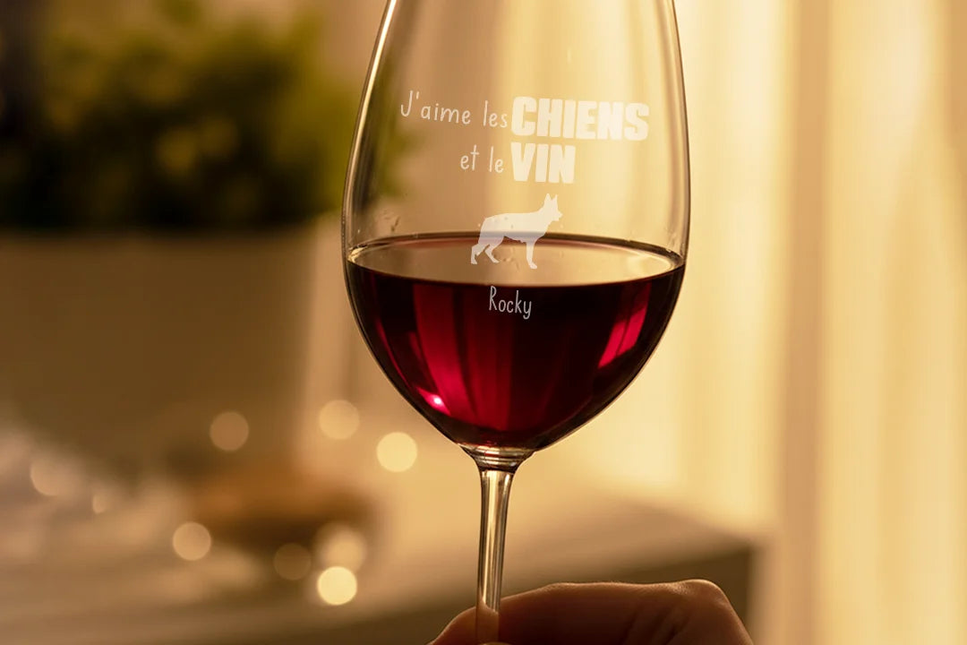 Avec ce grand verre à vin personnalisé, vous réunissez votre amour du vin et celui de votre compagnon à quatre pattes. La gravure amusante apporte toujours le sourire – parfait pour un moment cosy à la maison ou comme cadeau pour les amoureux des chiens.